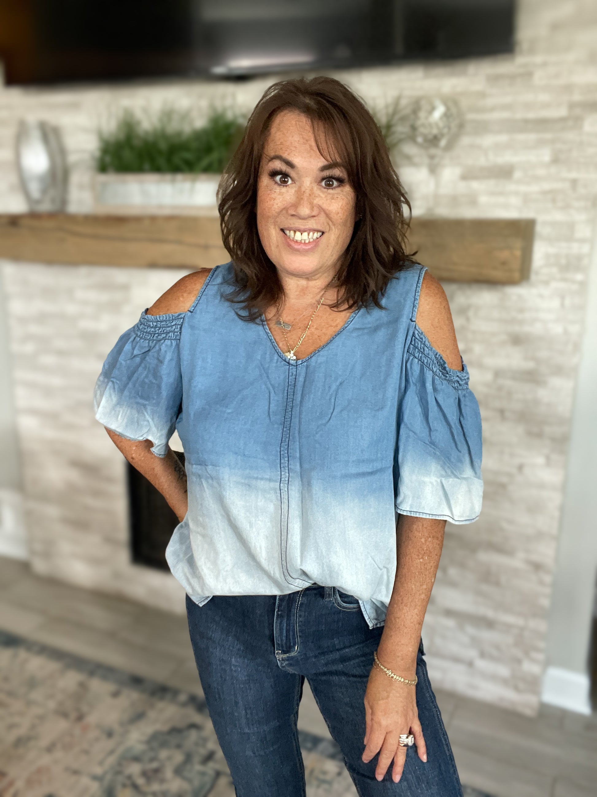 Chambray Ombre Denim Cold Shoulder Top