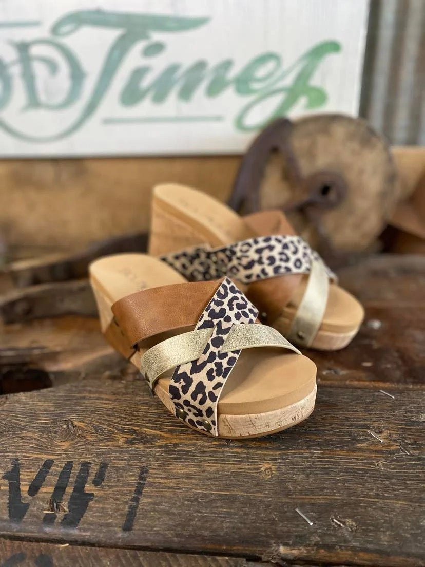 Corkys Leopard, Gold, and Cognac Cork Wedges - Size 9