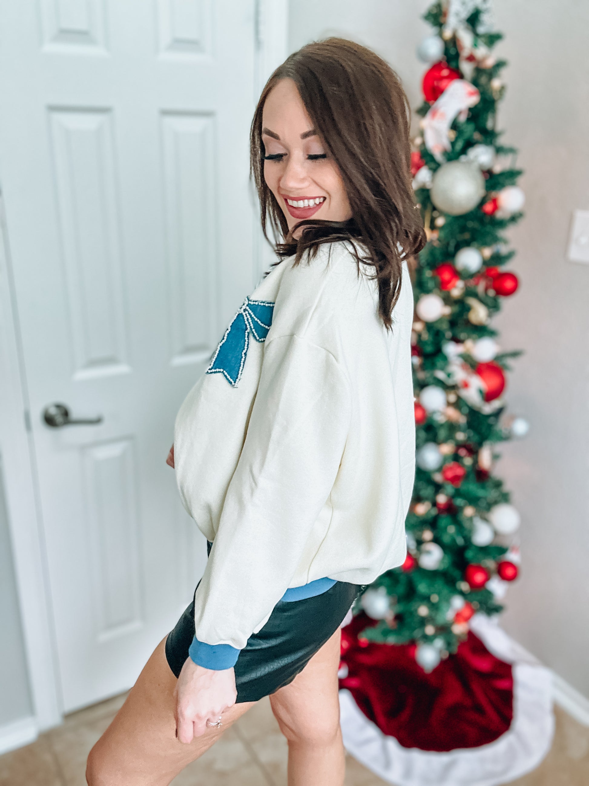 Not just any sweatshirt top, this one features a beautifully crafted denim bow patch that adds a touch of playful elegance to your wardrobe. With its long sleeves, it's perfect for cooler days and can be dressed up or down for any occasion. Upgrade your style game with our Bows and Kisses Sweater Top!