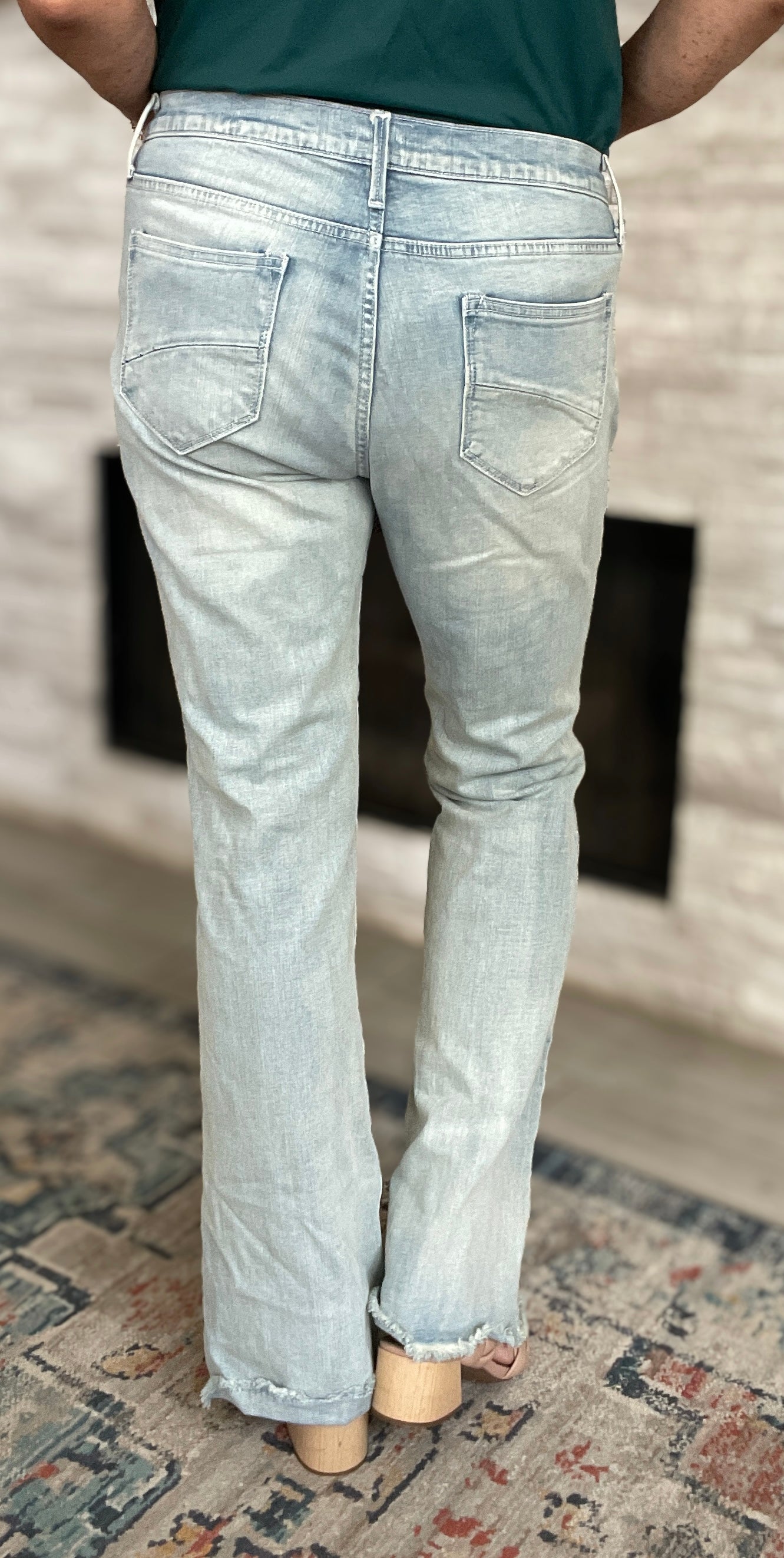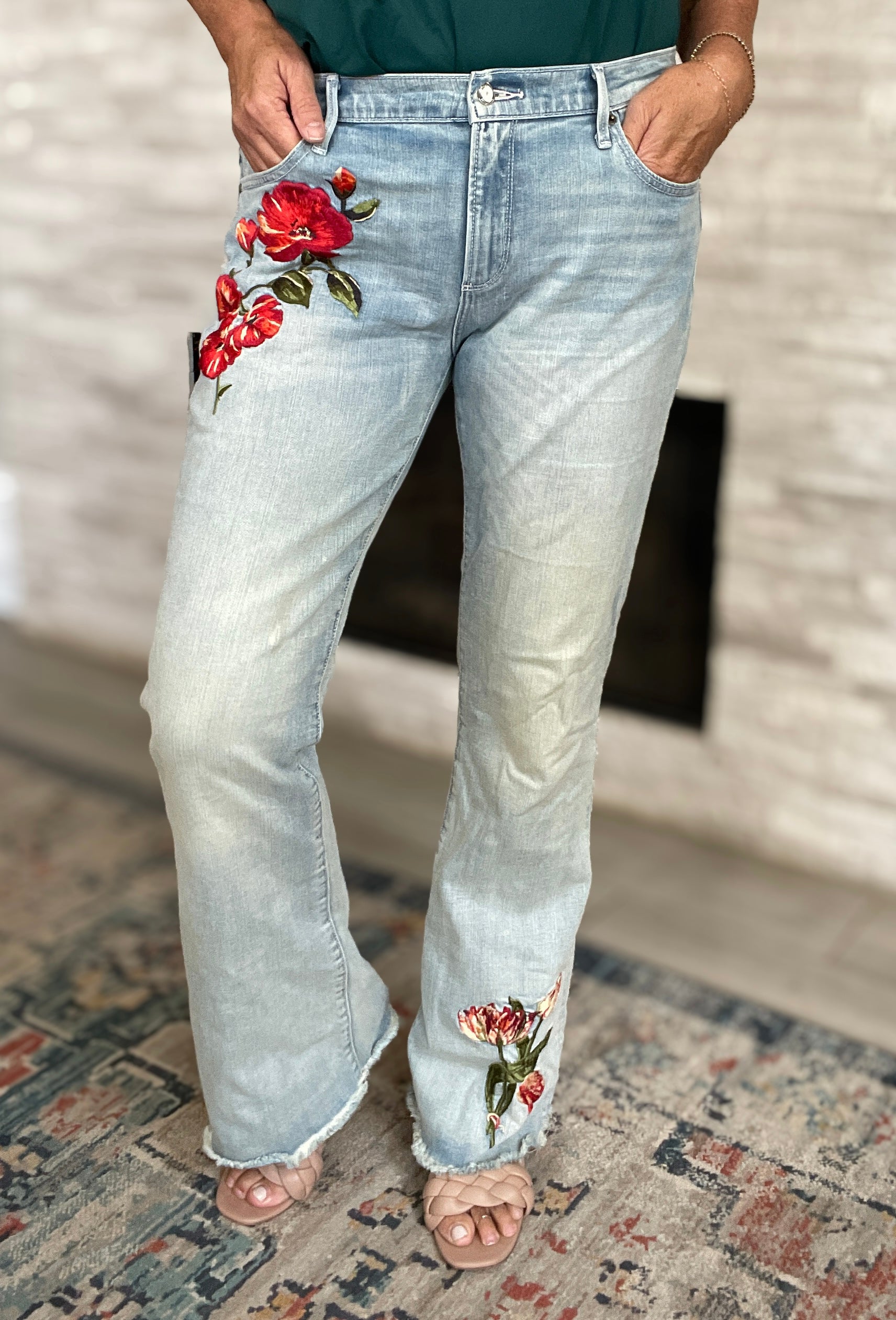 - Driftwood Eva Embroidered Floral Raw Hem Flare Jeans